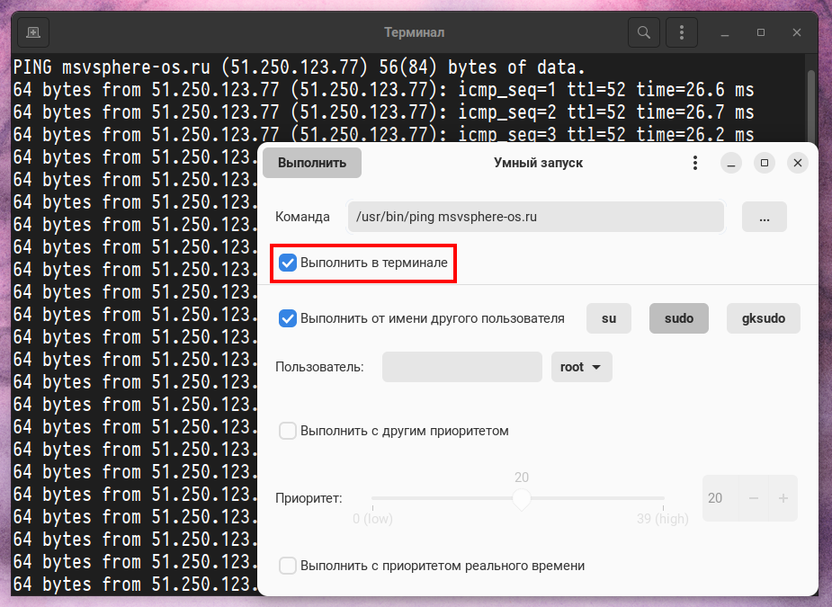 Для запуска приложения в терминальном режиме от имени другого пользователя необходимо выбрать исполняемый файл, при необходимости ввести имя пользователя и выбрать режим запуска. Далее, необходимо установить флажок «Выполнить в терминале» и нажать кнопку «Выполнить».