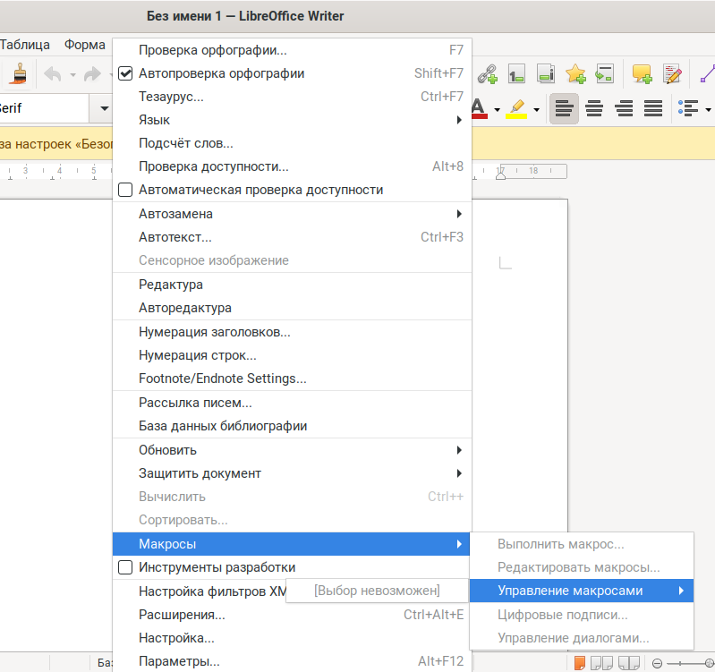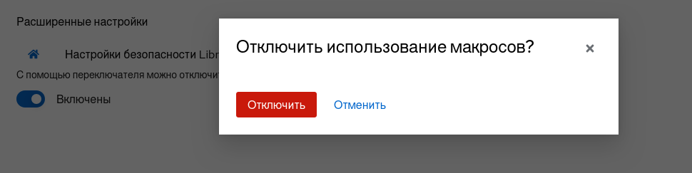 Расширение LibreOffice для Cockpit позволяет отключить использование макросов.