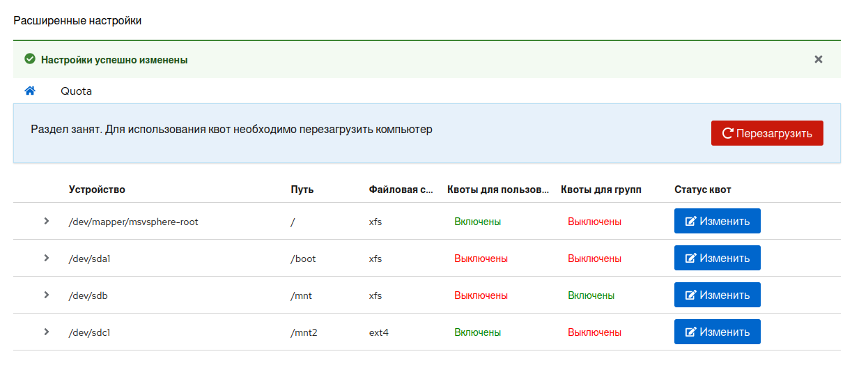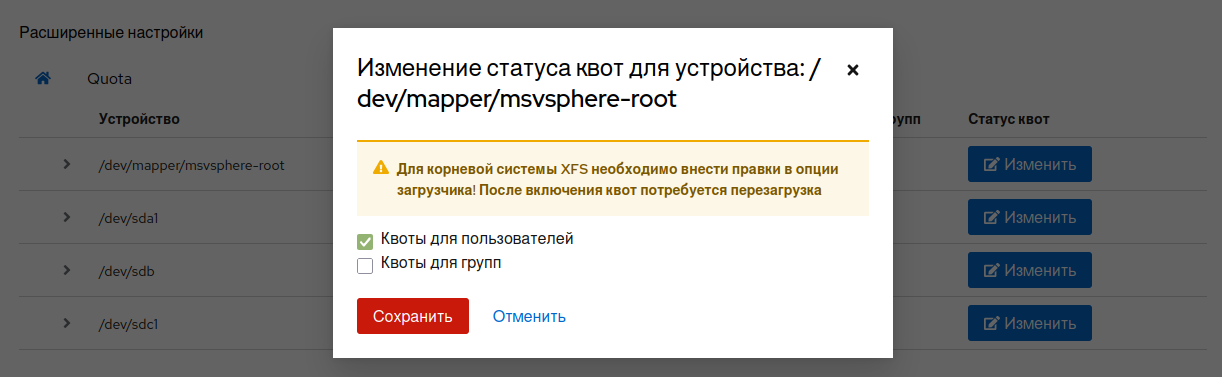 Для включения или выключения квот для пользователей/групп нажмите на кнопку «Изменить» для выбранной файловой системы. В открывшемся окне укажите нужный статус с помощью селекторов и сохраните изменения.