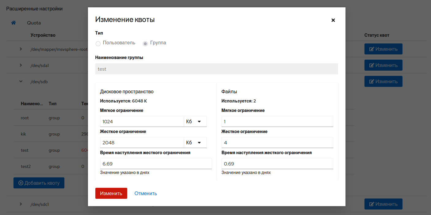 Для изменения квоты нажмите на кнопку „Изменить» для выбранного пользователя/группы.