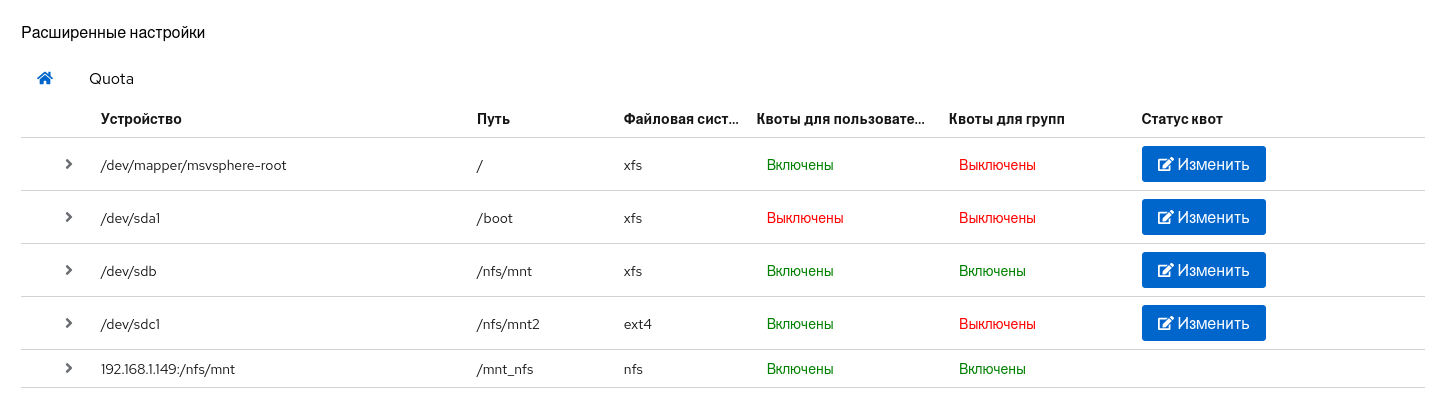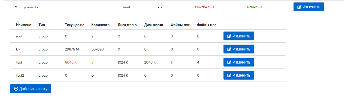 Для просмотра текущих настроек квот для пользователей/групп нажмите на строку файловой системы, откроется таблица с данными. В зависимости от статуса квот будут отображены только пользователи/группы или все вместе.