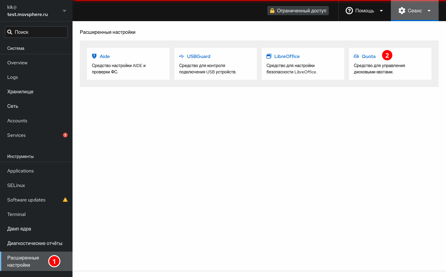Cockpit, на странице «Обзор» нажмите кнопку «Включить доступ с правами администратора» или кнопку «Ограниченный доступ», которая также доступна на других страницах системы управления. На приведённом ниже снимке экрана эти кнопки обозначены красным прямоугольником.
