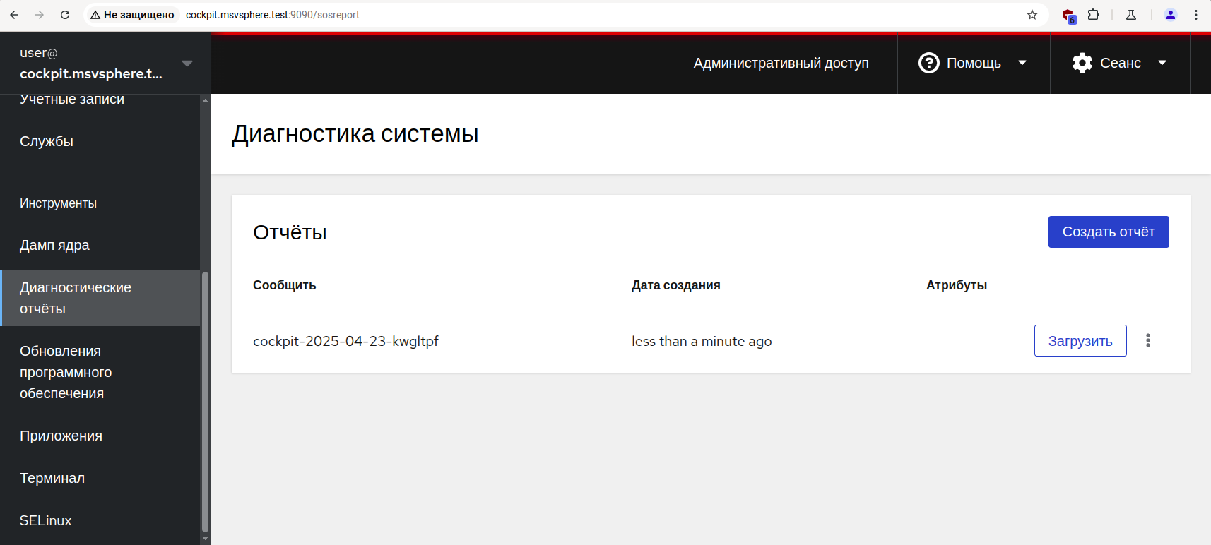 В состав панели управления Cockpit входит модуль для формирования диагностических отчётов, которые затем могут быть переданы для исследования в службу технической поддержки.