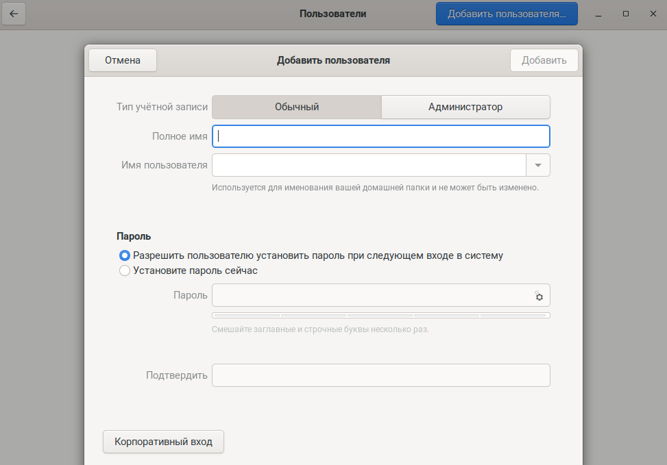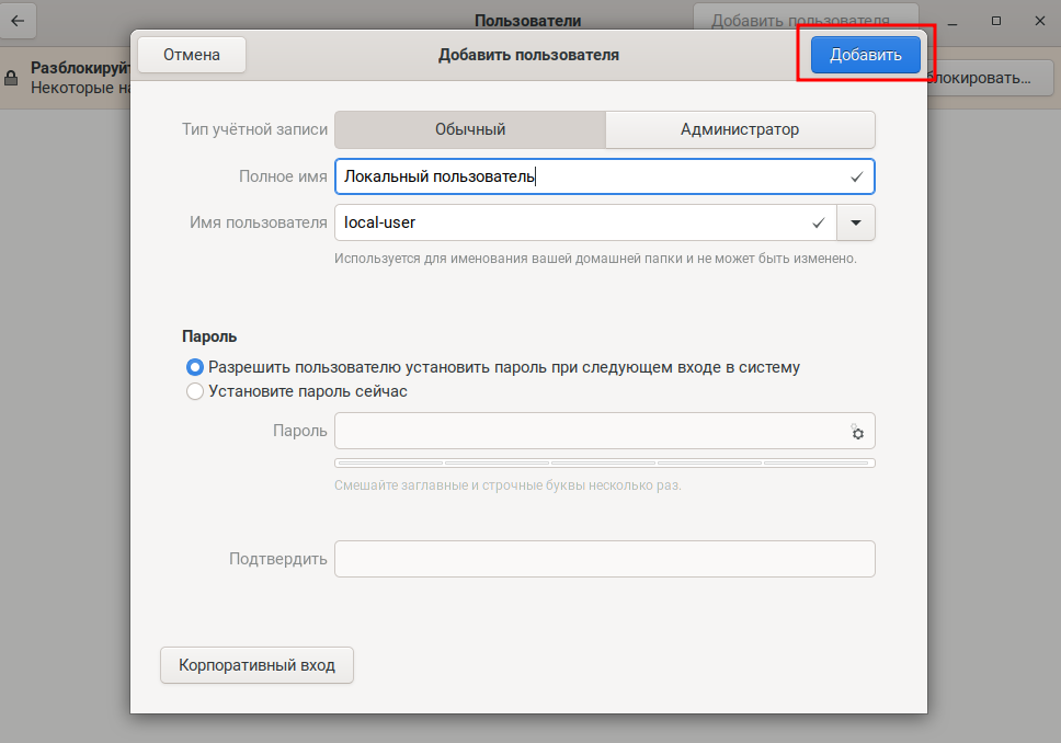 userдомашняя папка будет иметь вид/home/user/.Пароль — выберите, будет ли пароль задан при первом входе в систему или установлен при создании пользователя. При установке пароля во время создания пользователя вы можете воспользоваться функцией автоматической генерации пароля, нажав на значок «Шестерёнки».