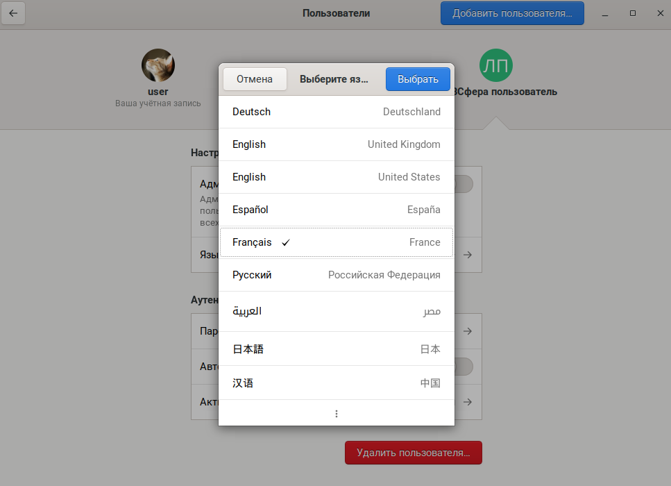 Для изменения языка перейдите в раздел «Пользователи» приложения «Настройки» любым удобным способом. Выберите «Язык», откроется окно выбора языка. Выберите необходимый язык и нажмите «Выбрать» в правом верхнем углу.