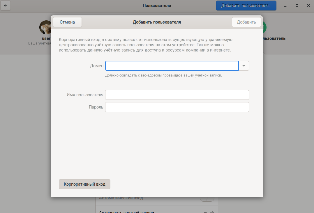 Если в вашей компании используется централизованное управление доступом и учётными записями, то вы можете добавить корпоративную учётную запись пользователя сразу при его создании. Необходимые данные для корпоративного входа обычно могут быть предоставлены администраторами вашей компании.