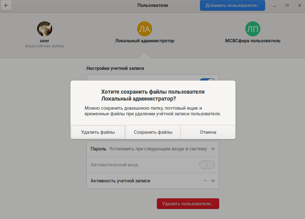 Для удаления учётной записи перейдите в раздел «Пользователи» приложения «Настройки» любым удобным способом. Затем нажмите на кнопку «Удалить пользователя», выберите сохранять ли файлы удаляемого пользователя и подтвердите своё решение.