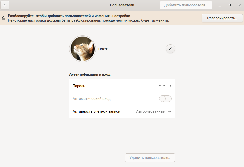 Для любой учётной записи (кроме суперпользователя) при начальном входе некоторые настройки будут заблокированы. Для разблокировки необходимо указать пароль.