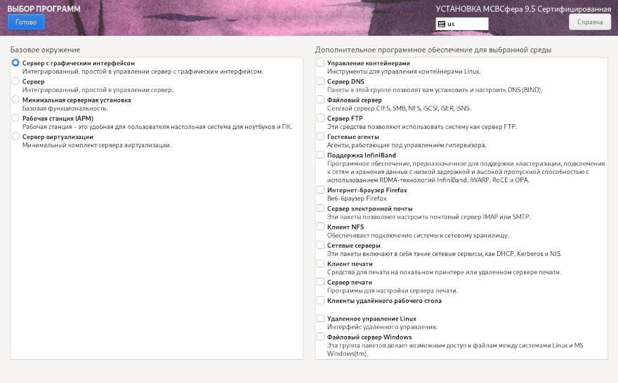 Вы также можете добавить дополнительное программное обеспечение для выбранного базового окружения, отметив его в окне справа. Пакеты будут загружены и установлены автоматически.
