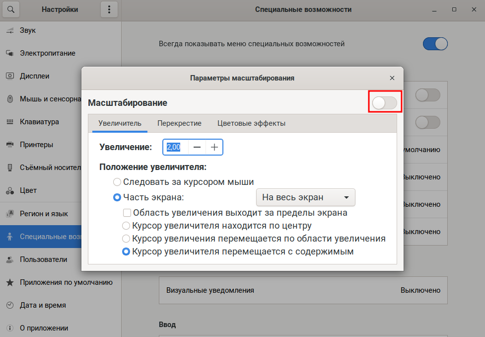 Масштабирование предоставляет функцию «экранной лупы», перемещая которую по экрану вы можете увеличивать отдельные его части.