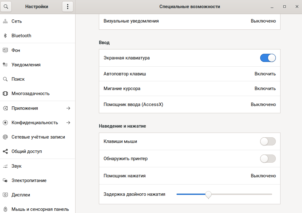 Для включения экранной клавиатуры перейдите в «Настройки» → «Специальные возможности» → раздел «Ввод» и включите «Экранная клавиатура», передвинув слайдер. Изменения вступят в силу немедленно.