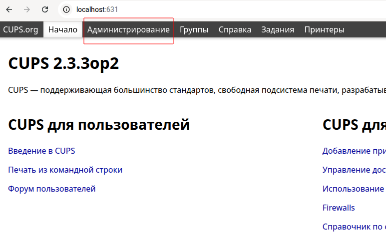 Авторизуйтесь в CUPS и перейдите во вкладку «Администрирование».