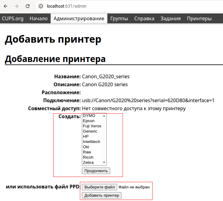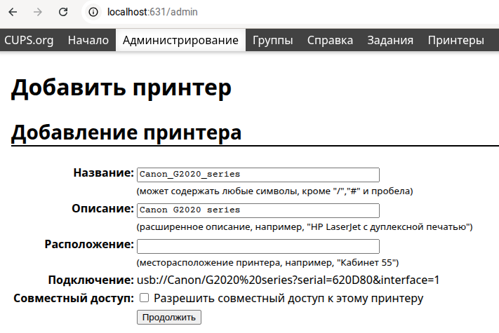 Панель управления доступна в браузере по адресу http://localhost:631.
