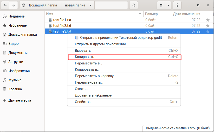 Нажмите CTRL + C или нажмите правой кнопкой на выделенный файл и в появившемся меню нажмите Копировать.