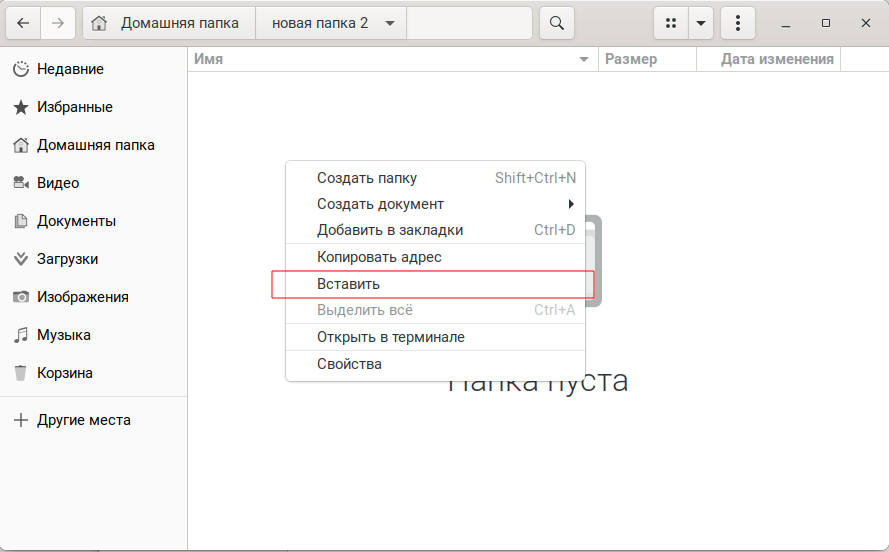 Откройте папку, в которую нужно скопировать файл, и нажмите CTRL + V, либо нажмите на пустую область в папке и нажмите Вставить.