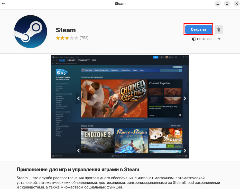 Вы можете открыть приложение «Steam» сразу после установки из «Центра приложений».
