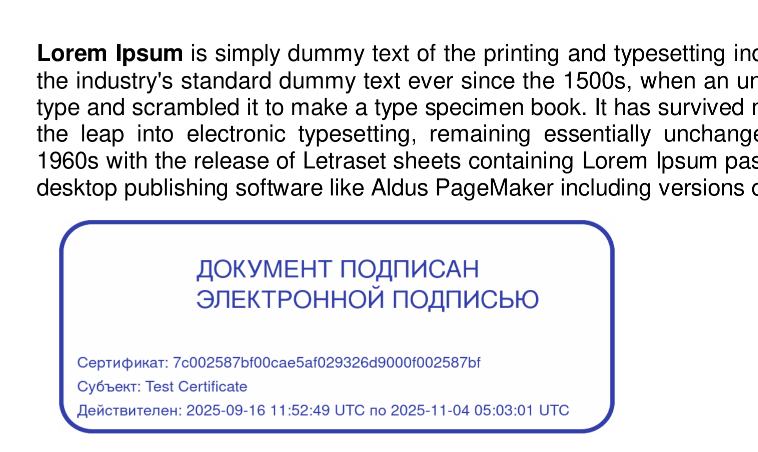создание и встраивание штампа подписи в соответствии с требованиями 63-ФЗ в PDF-документ;