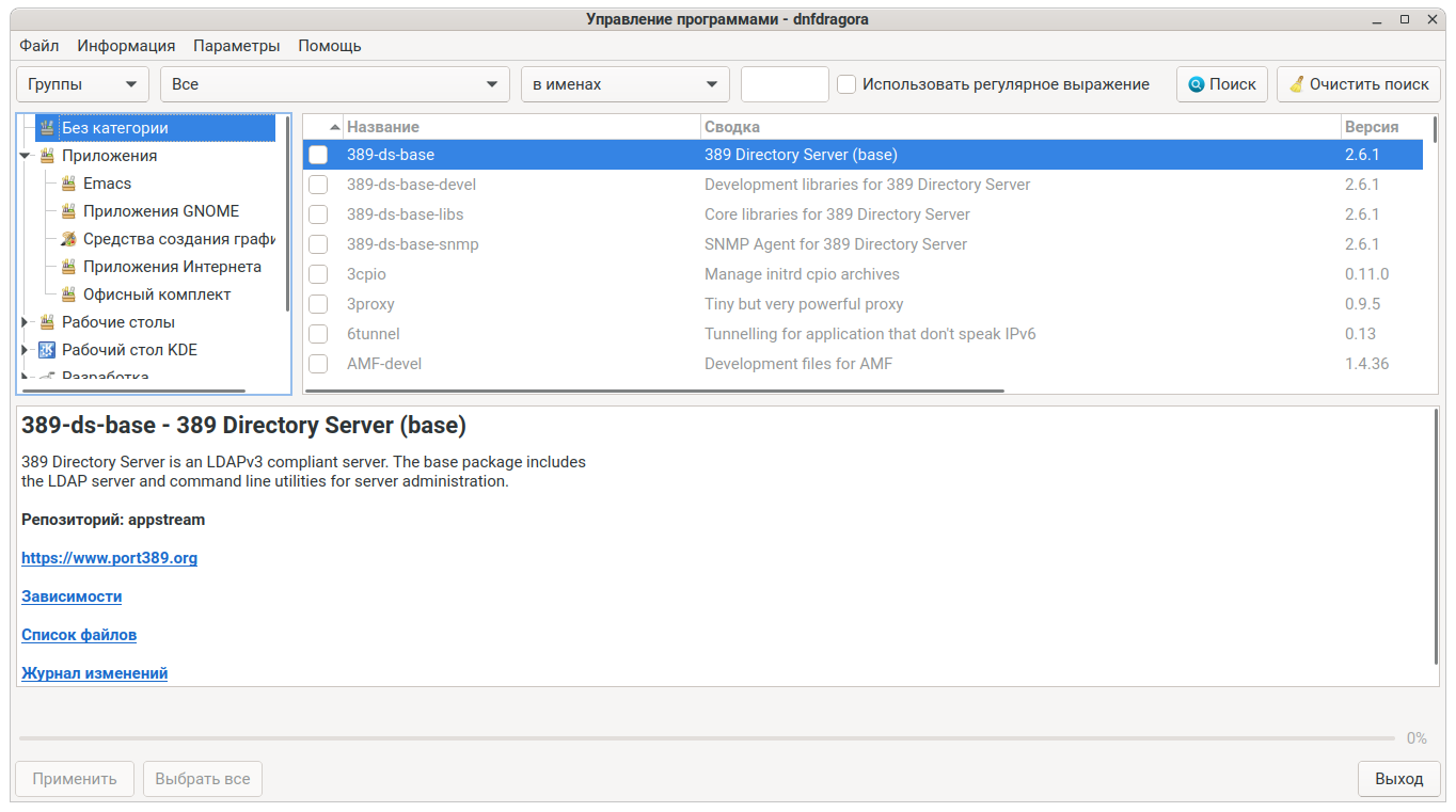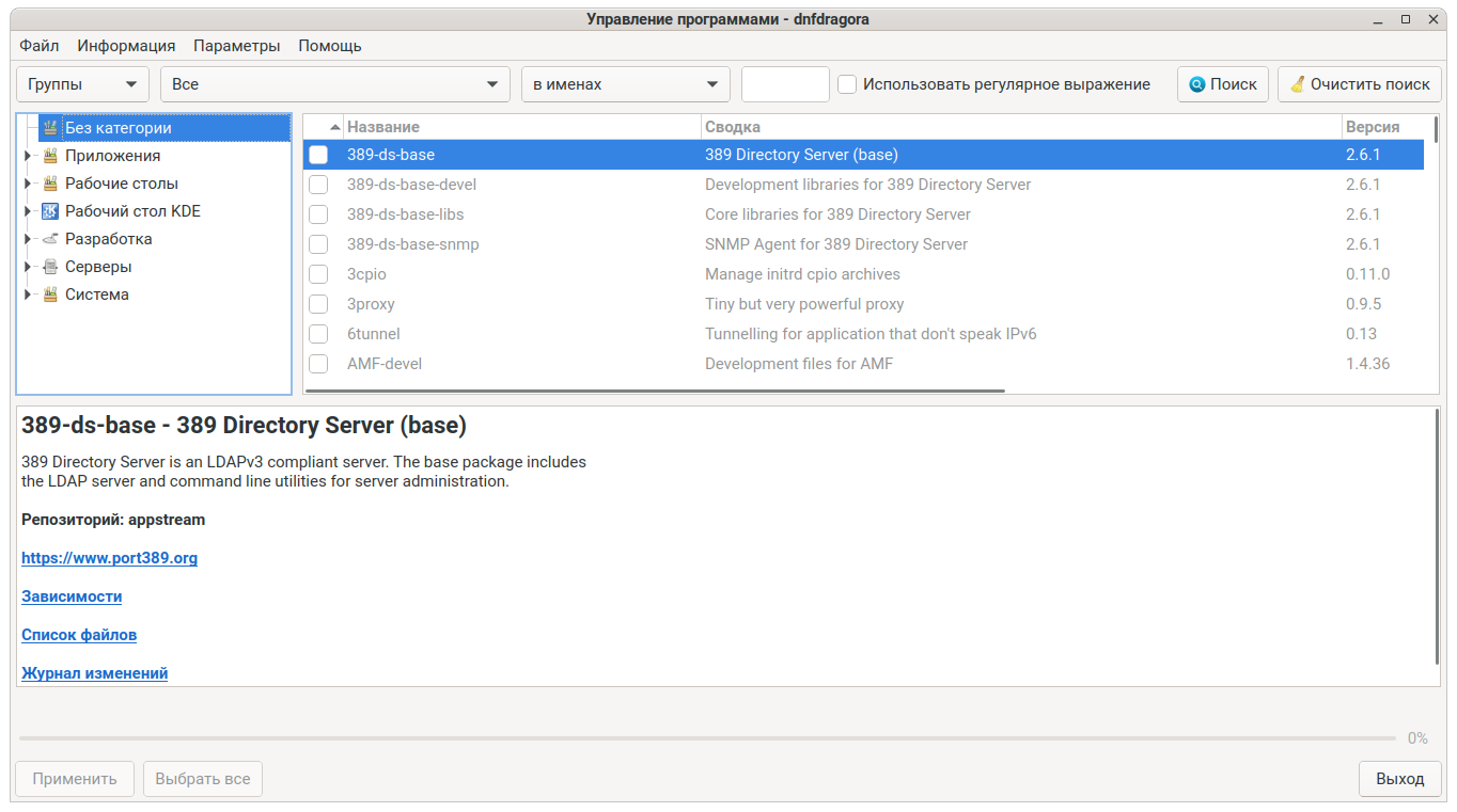 dnfdragora автоматически группирует приложения в «Категории». Это упрощает навигацию по пакетам.