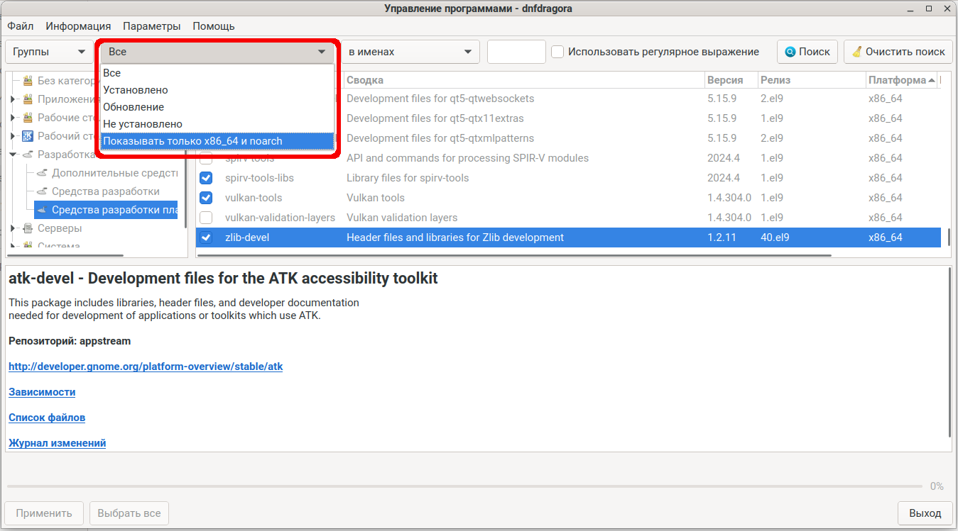 Чтобы отображать в списках только x86_64 и noarch нажмите на «Все», а после выберите «Показывать только x86_64 и noarch».